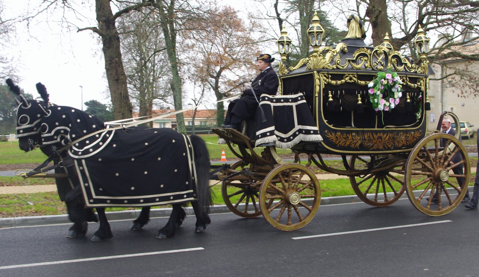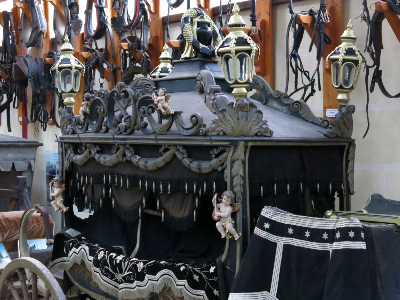 Les corbillards peuvent avoir un très riche décor de sculpture. La plupart possèdent des motifs d'amortissement (bouquets de plumes d'autruche) et une garniture textile composée de pentes, rideaux, housse de siège.
