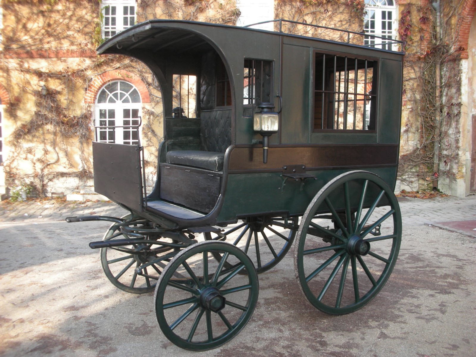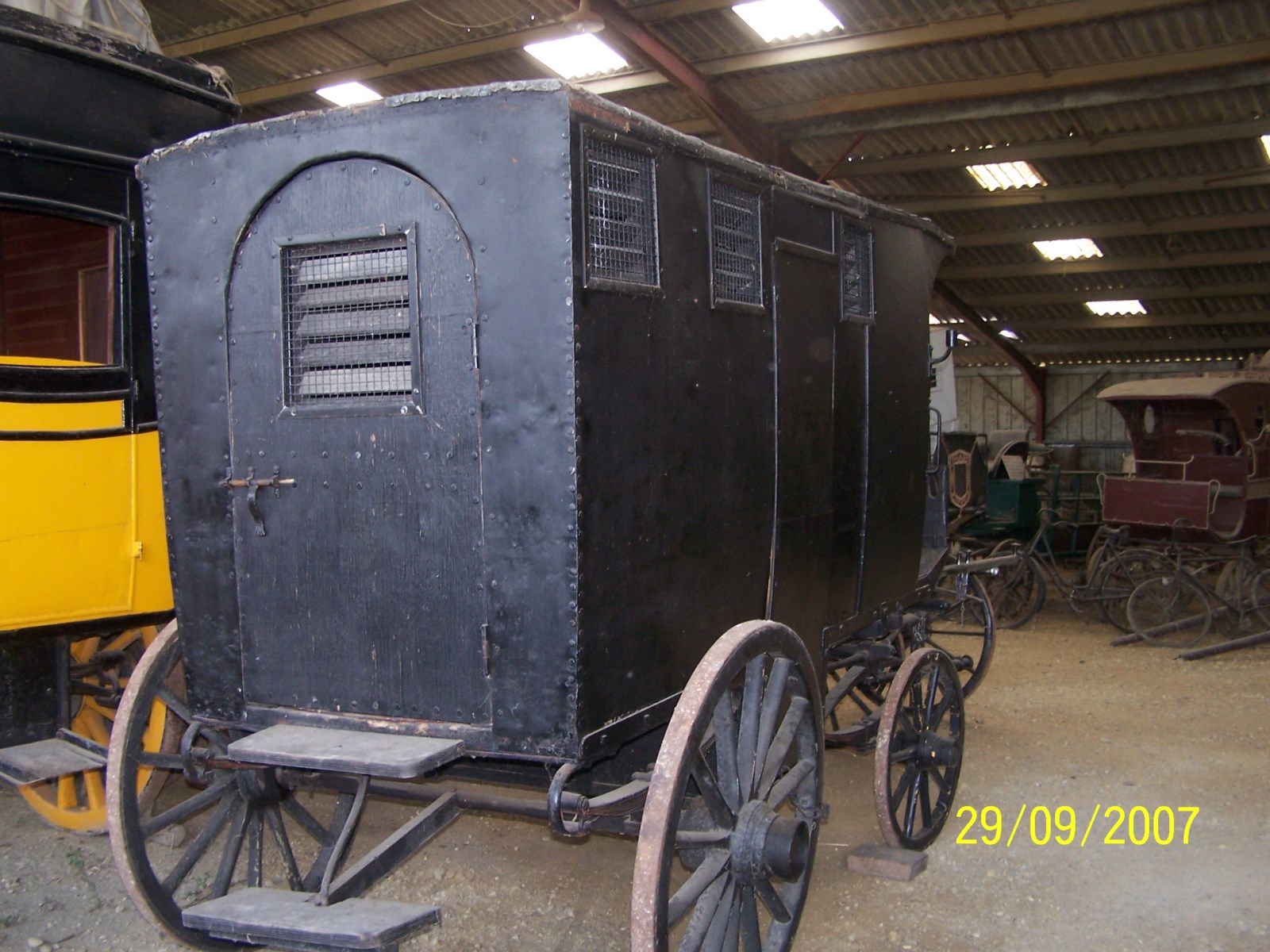 Voiture pour le transport des prisonniers. Sa caisse est proche de celle d'un grand omnibus, avec accès par une portière sur le panneau arrière.