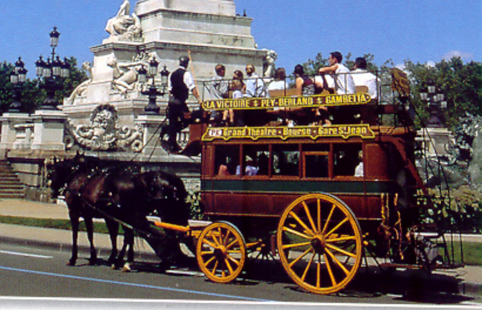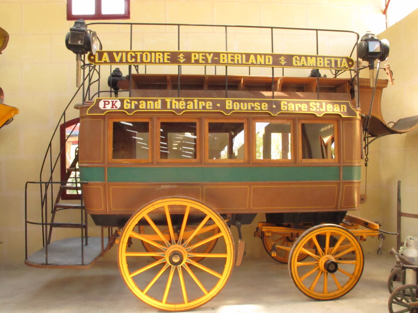 Certains omnibus publics sont équipés de sièges fins sur l'impériale, couverte ou non, à laquelle on accède par un étroit escalier ménagé à l'arrière de la voiture.